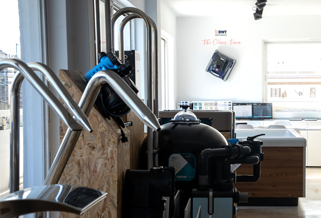 Το ισόγειο λειτουργεί ως κεντρικός χώρος εργασιών και υποστήριξης, ενώ ο εκθεσιακός όροφος έχει σχεδιαστεί για να προσφέρει μια άνετη, επαγγελματική και πλήρως ενημερωτική εμπειρία σε όποιον θέλει να εξερευνήσει λύσεις για την πισίνα ή το spa του.